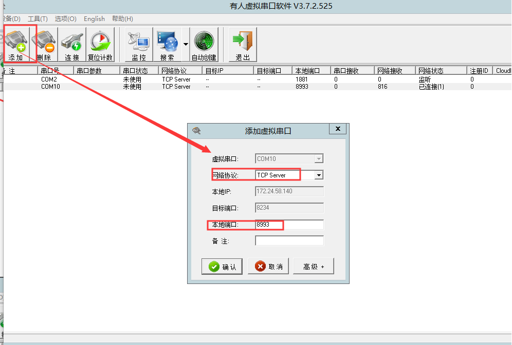 5. 安裝虛擬串口后,設(shè)置方法:添加虛擬串口-->選擇COM口-->TCP server(軟件會(huì)自動(dòng)鎖定本地IP)-->設(shè)置本地端口號(hào)(和DTU設(shè)置的服務(wù)器端口號(hào)一致,本案例中是8993)-->確認(rèn)