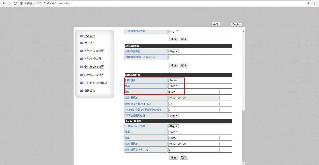 打開USR-TCP232-TEST網絡助手,左側串口部分用COM4打開,串口參數和DR404設置一致,網絡端設置TCP server,本機IP填電腦的IP 10.10.100.100,本地端口填8899。