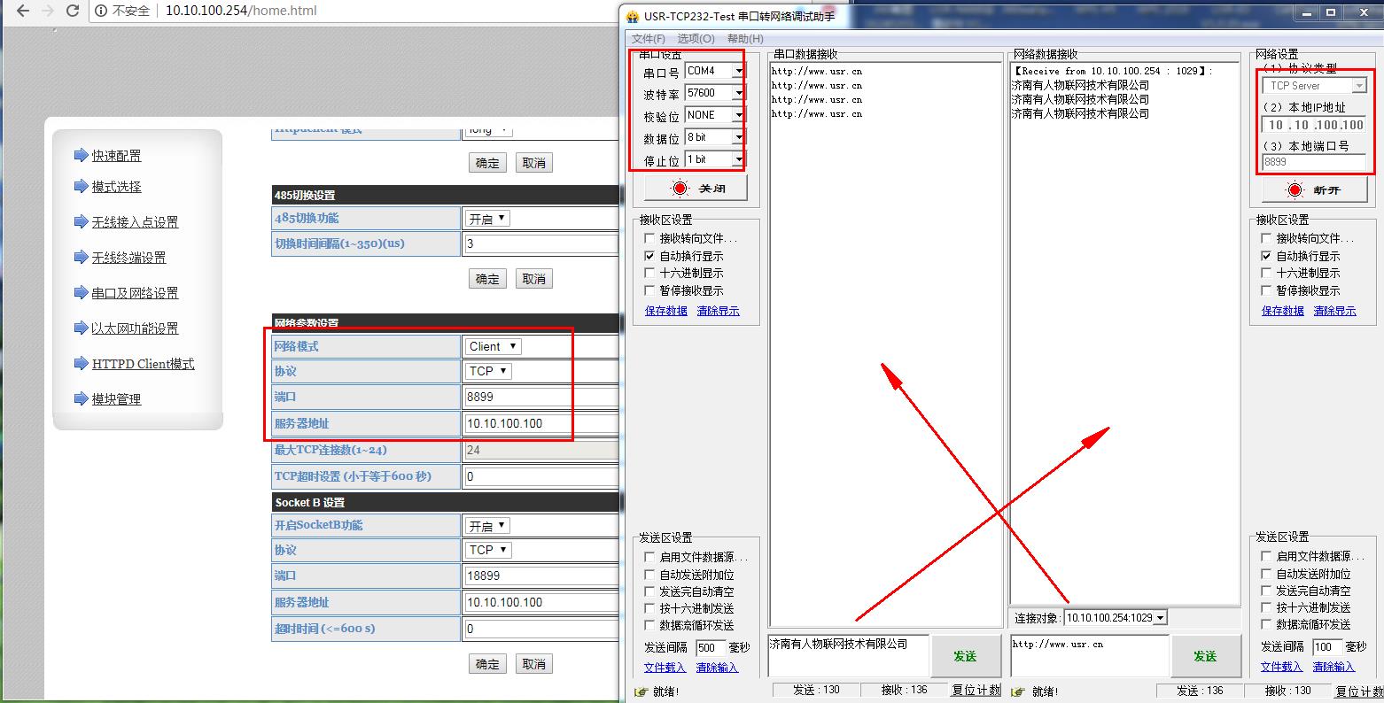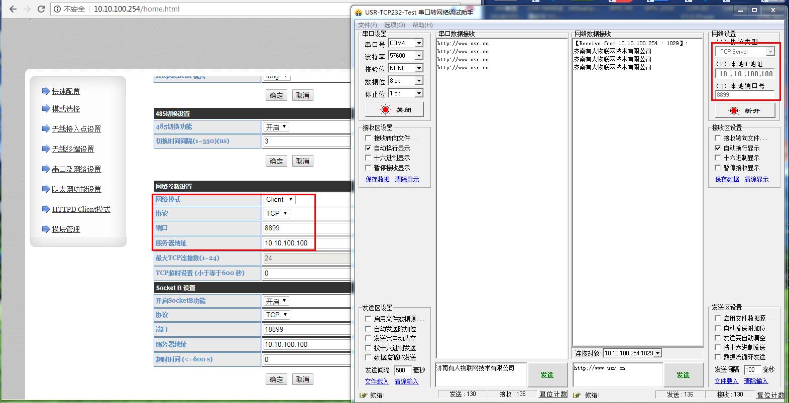 然后用USR-TCP232-TEST網絡助手測試串口和網絡之間的數據傳輸。