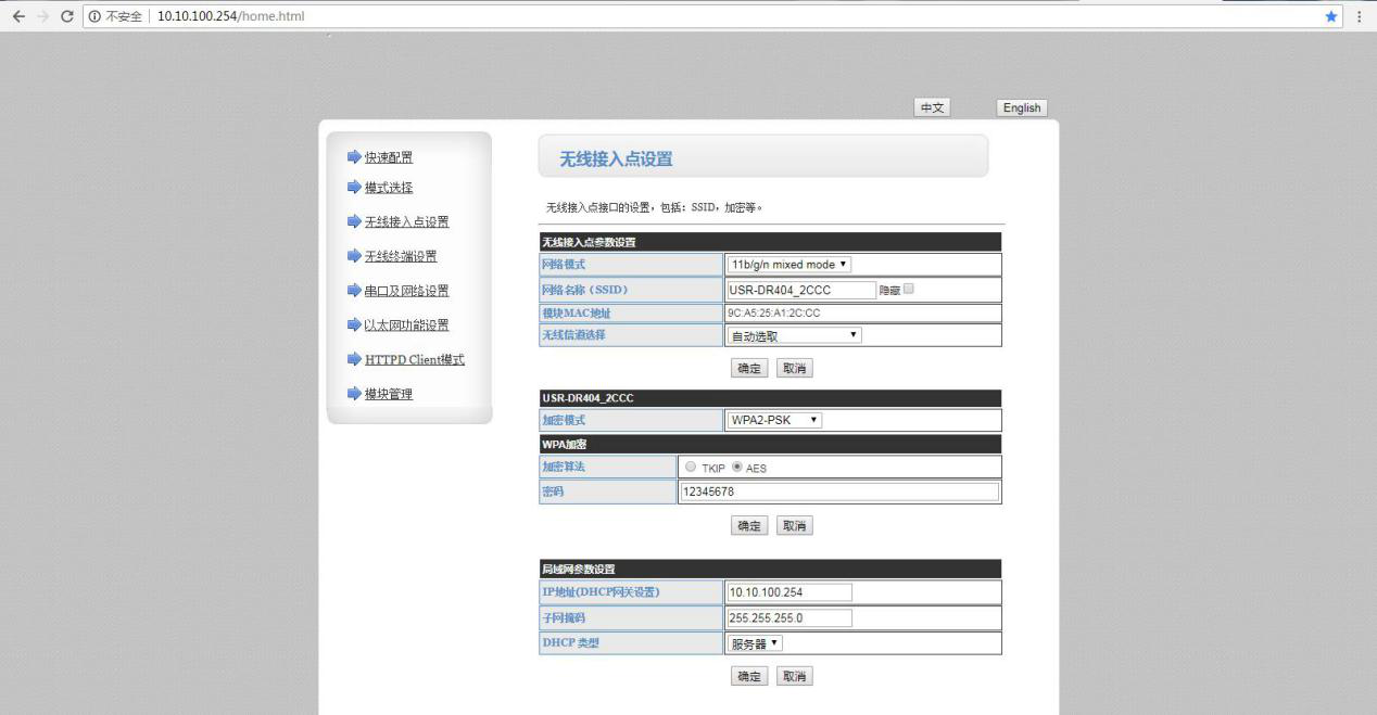 DR404在網頁上,串口及網絡設置,設置網絡模式TCP client,服務器IP填電腦IP10.10.100.100,端口填8899。保存參數,重啟DR404