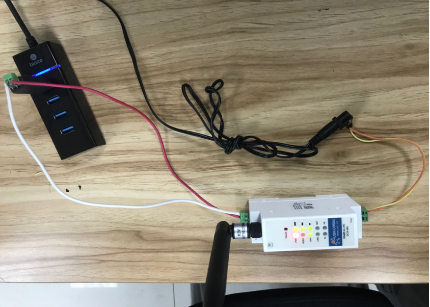 1. 硬件連接:裝上sim卡,sim卡依照圖1(1)的方式放入dtu當中。接上天線(4g天線),USR-DR504的串口通過USB轉485接到PC上,用我司提供的適配器供電,整個連接圖如圖1(2)所示。