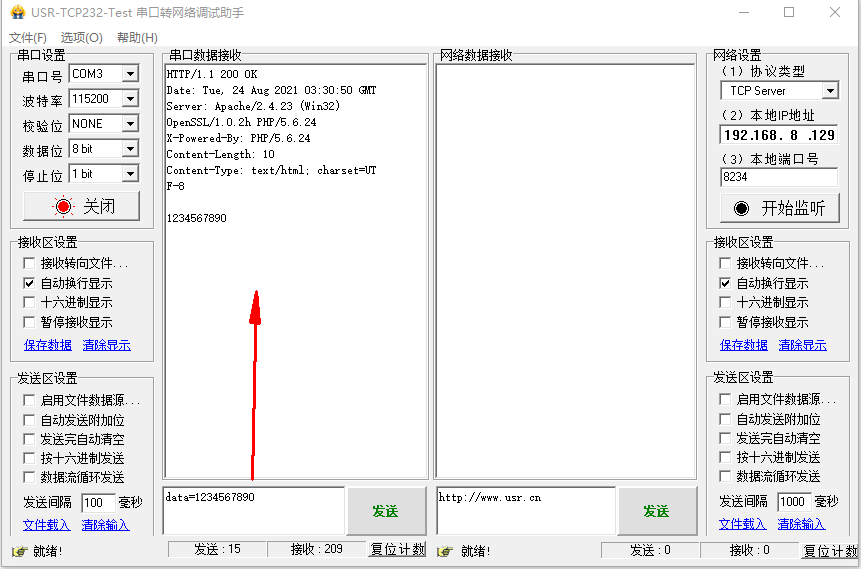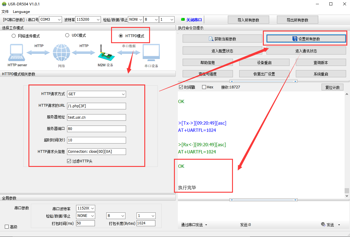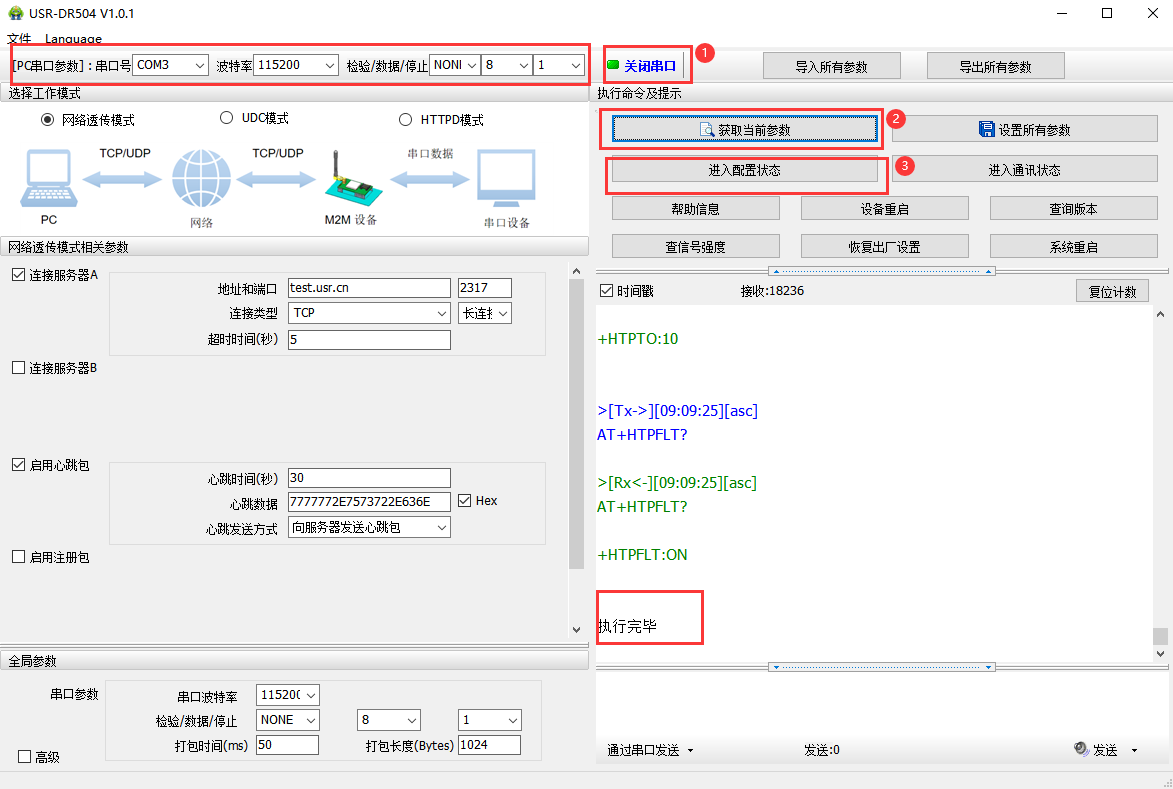 4. 打開串口后,先點擊進入配置狀態,如果模塊能返回+ok的字符,說明電腦和模塊連接是沒有問題的;然后點擊進入通訊狀態如圖,做數據通訊測試。如果不返回+OK的話,請參考(步驟3)