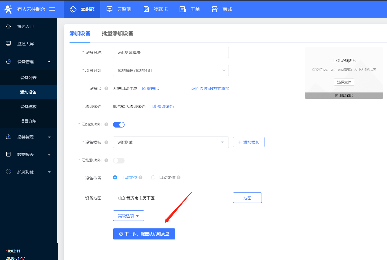 6、設置設備名稱,和項目分組,C215目前只能使用ID方式添加設備id;設備id和密碼設置默認就可以,選擇云組態,添加數據模板;