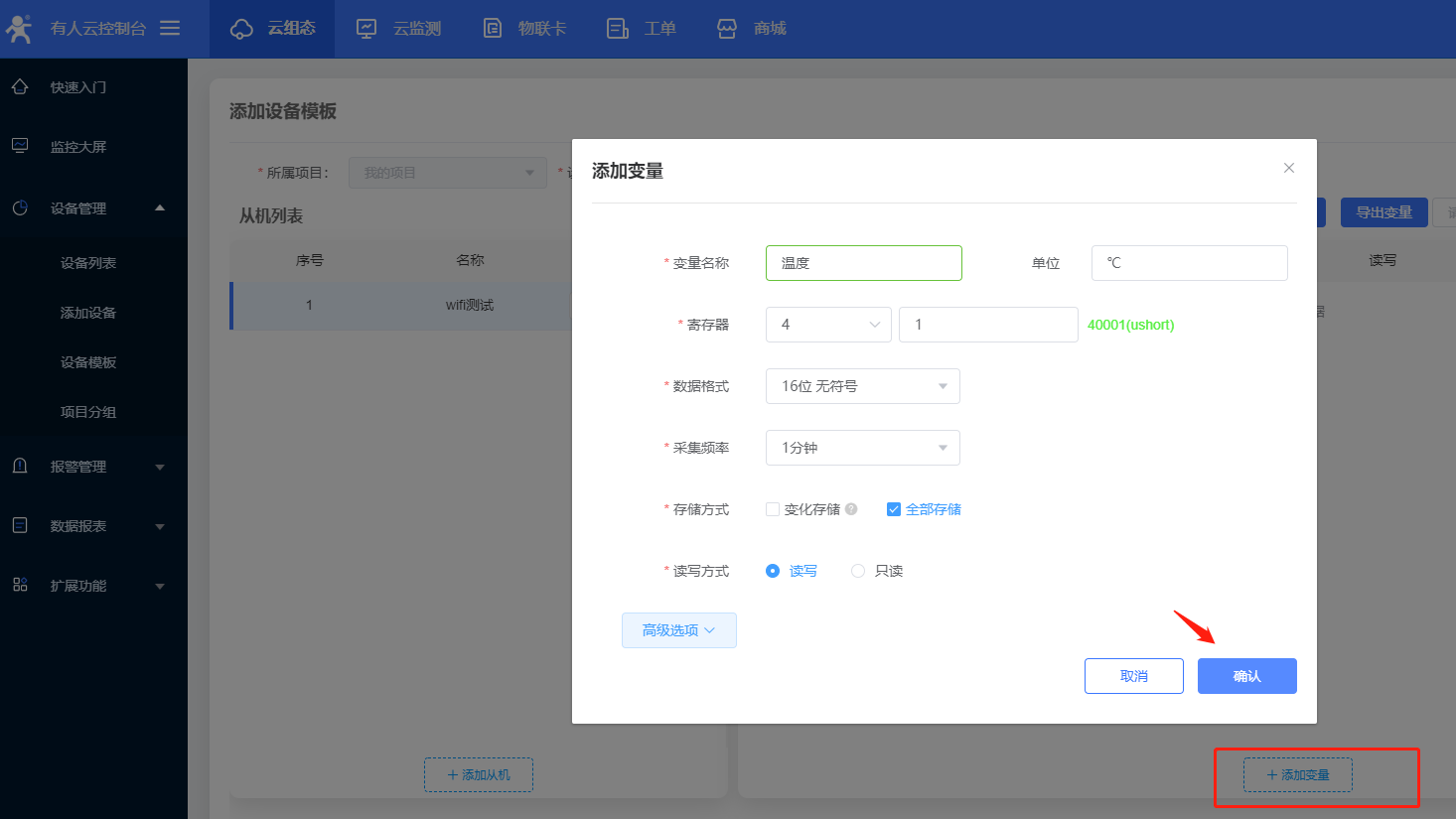 5、本次案例是C215連有人云進行數據顯示,可以進入云組態,選擇添加設備;