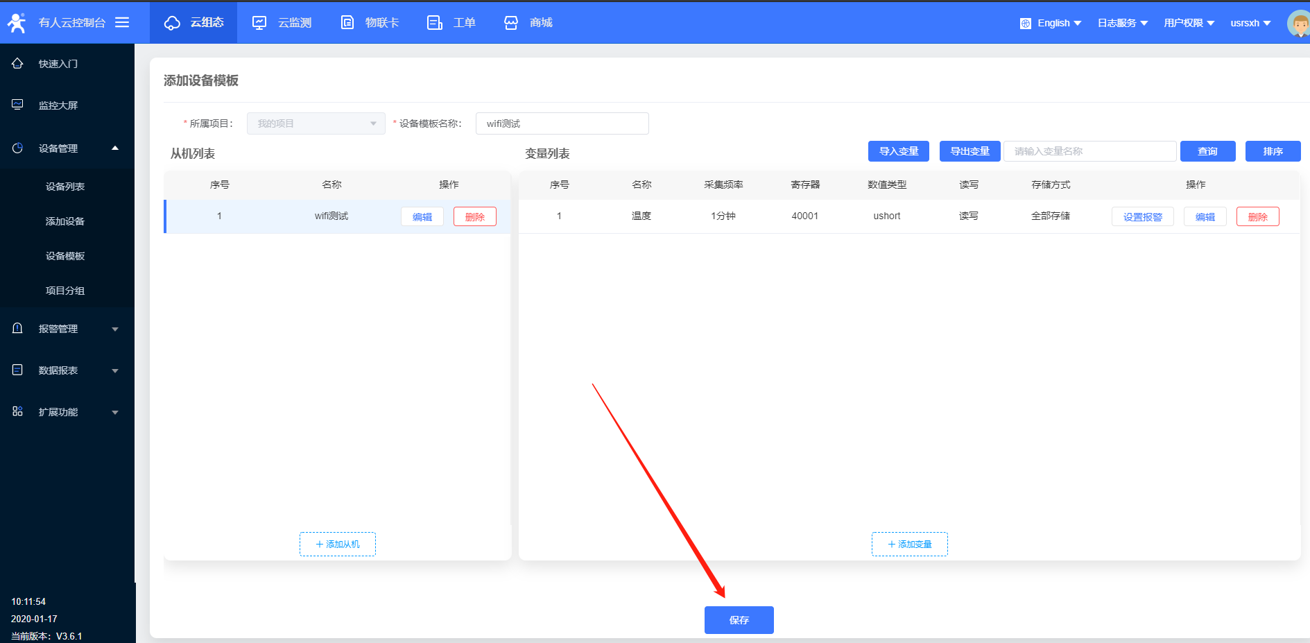 7、模板更改名稱,選擇modbus rtu協議,點擊保存
