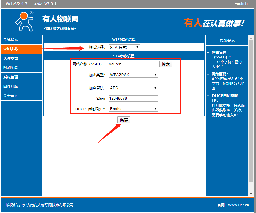12、內置網頁的賬號和密碼都是admin,進入以后選擇模式選擇模式選擇為sta模式,設置要連接的wifi名稱、加密類型、算法、密碼,點擊保存;(先不要重啟,等設置完所有的參數再重啟設備)