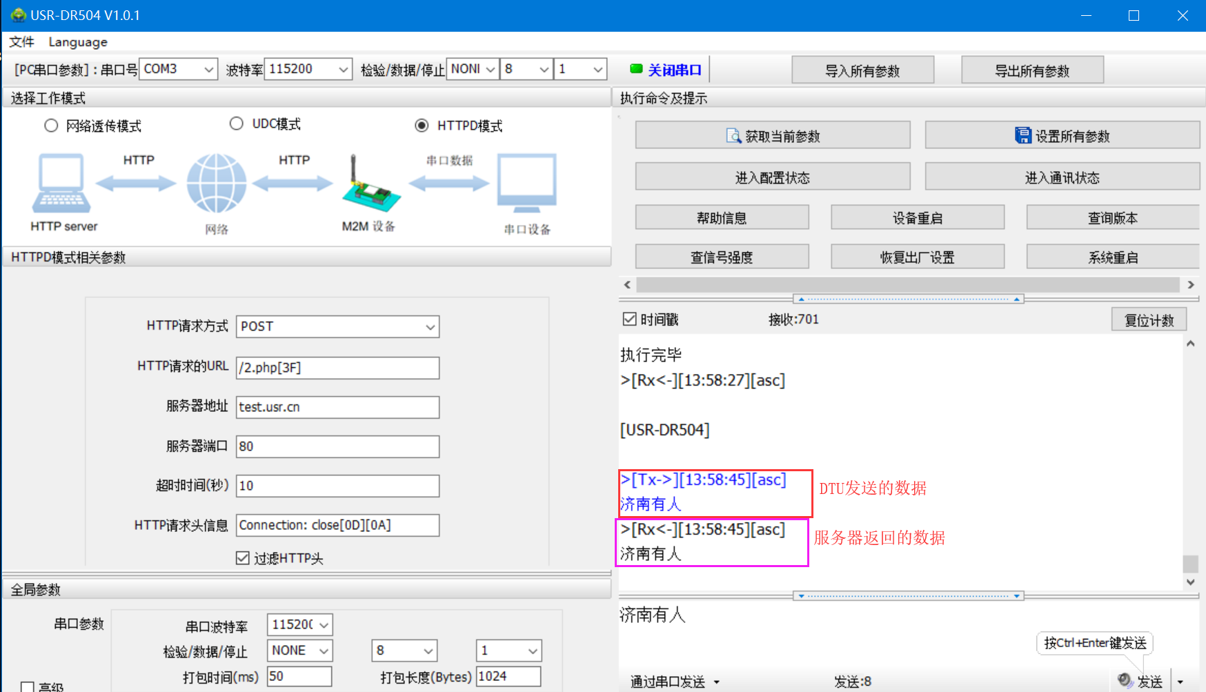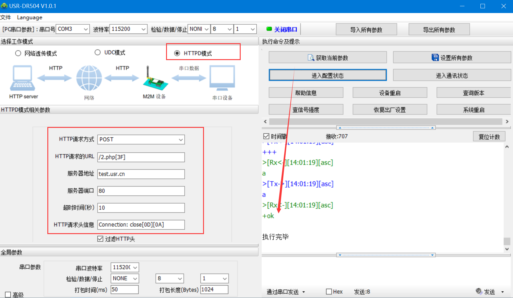 點擊進(jìn)入配置狀態(tài),返回OK說明進(jìn)入配置狀態(tài)成功-->配置HTTPD模式相關(guān)參數(shù)-->點擊設(shè)置所有參數(shù)-->點擊設(shè)備重啟