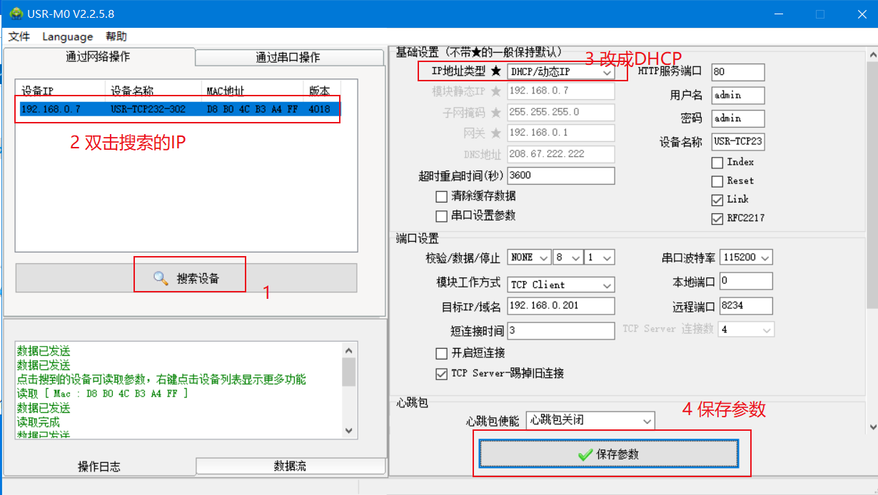 1、將M0模塊網線直連電腦,打開參數設置軟件,點擊“搜索設備”,點擊搜索到的設備名稱,將IP類型改為“DHCP”,點擊“保存參數”,如圖。