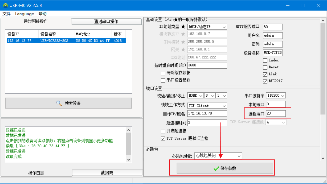 3、將M0模塊網線直連路由器,電腦連入該路由器,打開參數設置軟件,重新搜索設備,設置模塊工作方式為“TCP Client”,目標IP為該服務器的IP,遠程端口號為服務器的上位機軟件的端口號。點擊“保存參數”,如圖