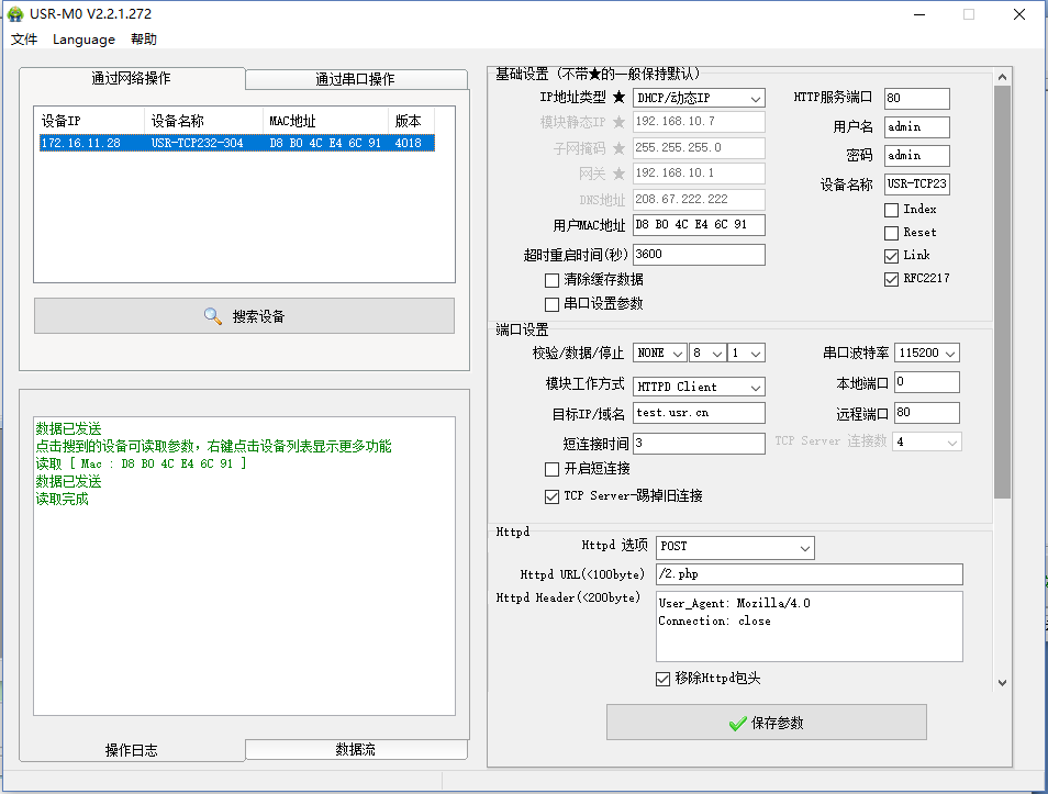 2、模塊設置參數:打開設置軟件,模塊設置為Httpd Client模式,請求方式POST,URL為/2.php,設置服務器地址test.usr.cn,端口80,設置并保存所有參數,重啟模塊。(本說明文檔使用為有人測試服務器)
