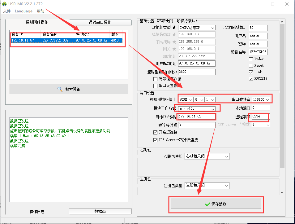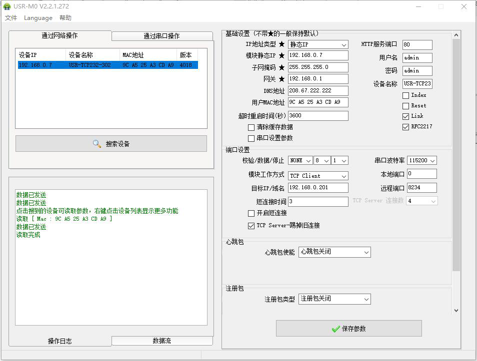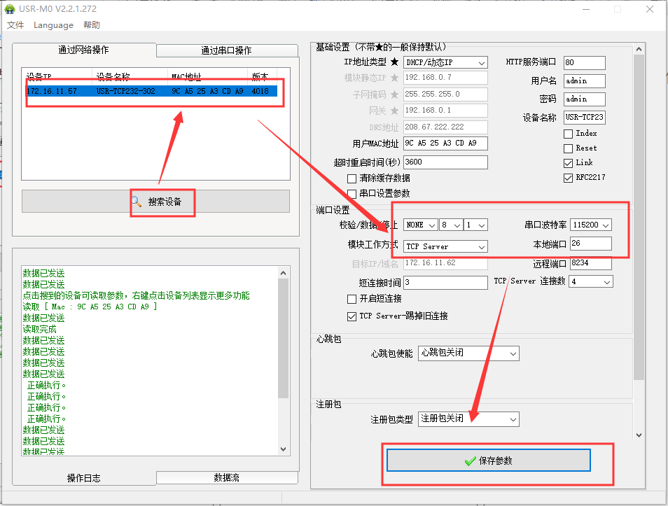 點擊“搜索設備”,當搜索列表中出現302的設備后,單擊搜索到的設備,設置配置信息并保存