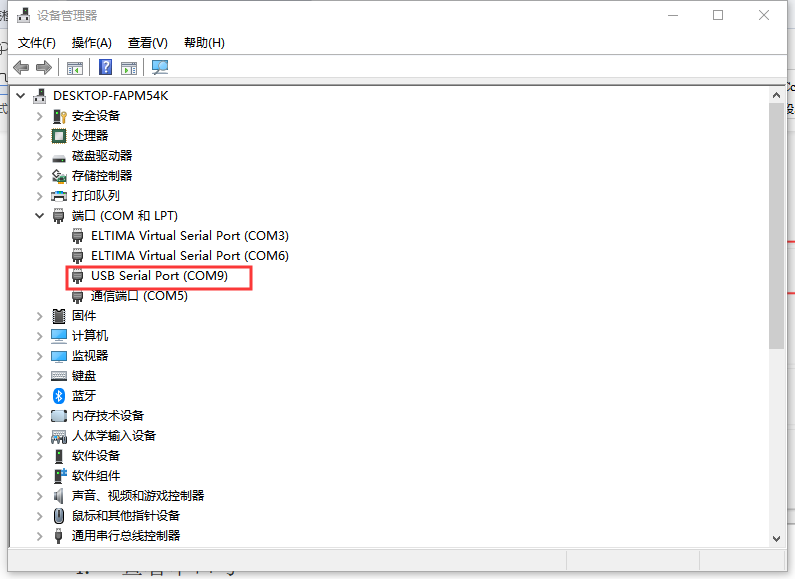 在設備管理器中查看端口信息,確定302串口使用的串口號,如下圖所示電腦端口號為COM9
