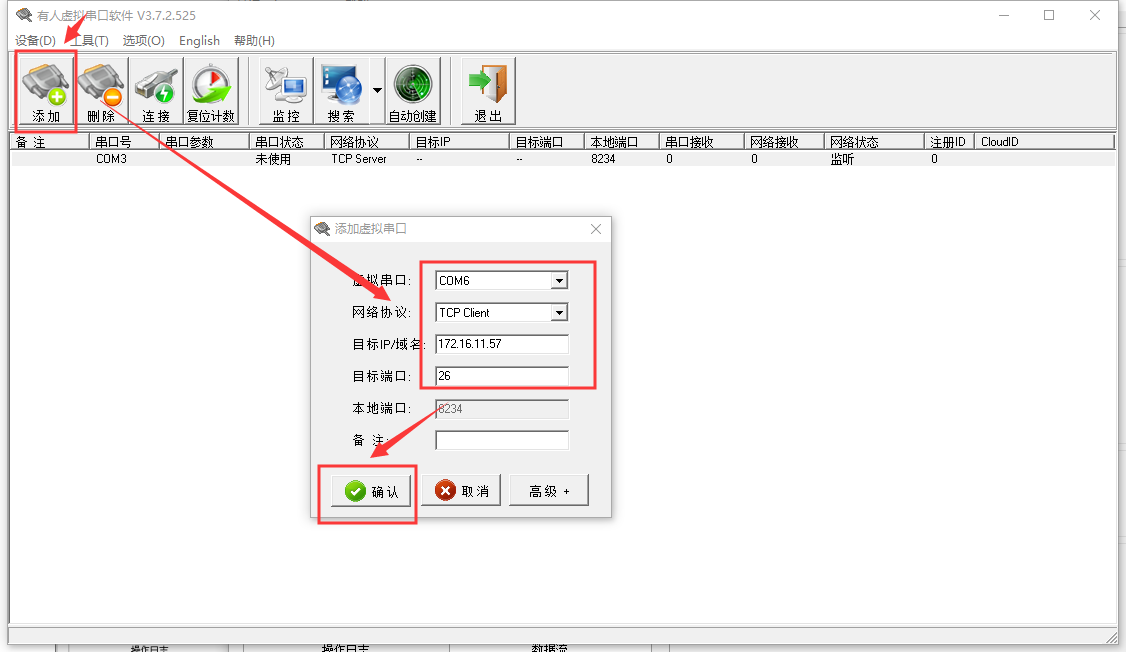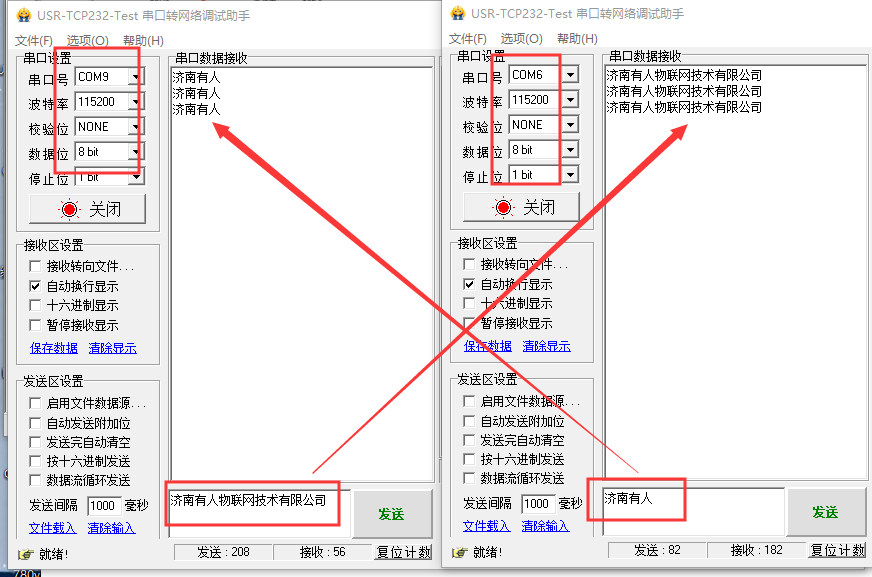 同時打開兩個串口轉網絡助手軟件。一個選擇虛擬串口,一個選擇COM9,即可進行收發測試