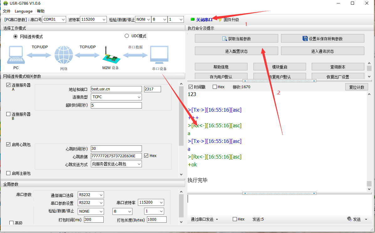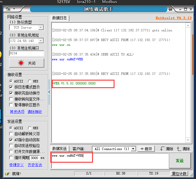 4. 連接成功后,可以從服務器端發(fā)送網(wǎng)絡AT指令來查詢/設置DTU的參數(shù)