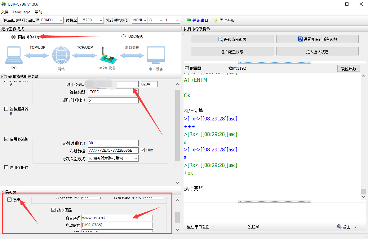2.選擇網(wǎng)絡透傳工作模式,填寫要連接的服務器的IP和端口號,勾選高級查看命令密碼(命令密碼可以自定義)