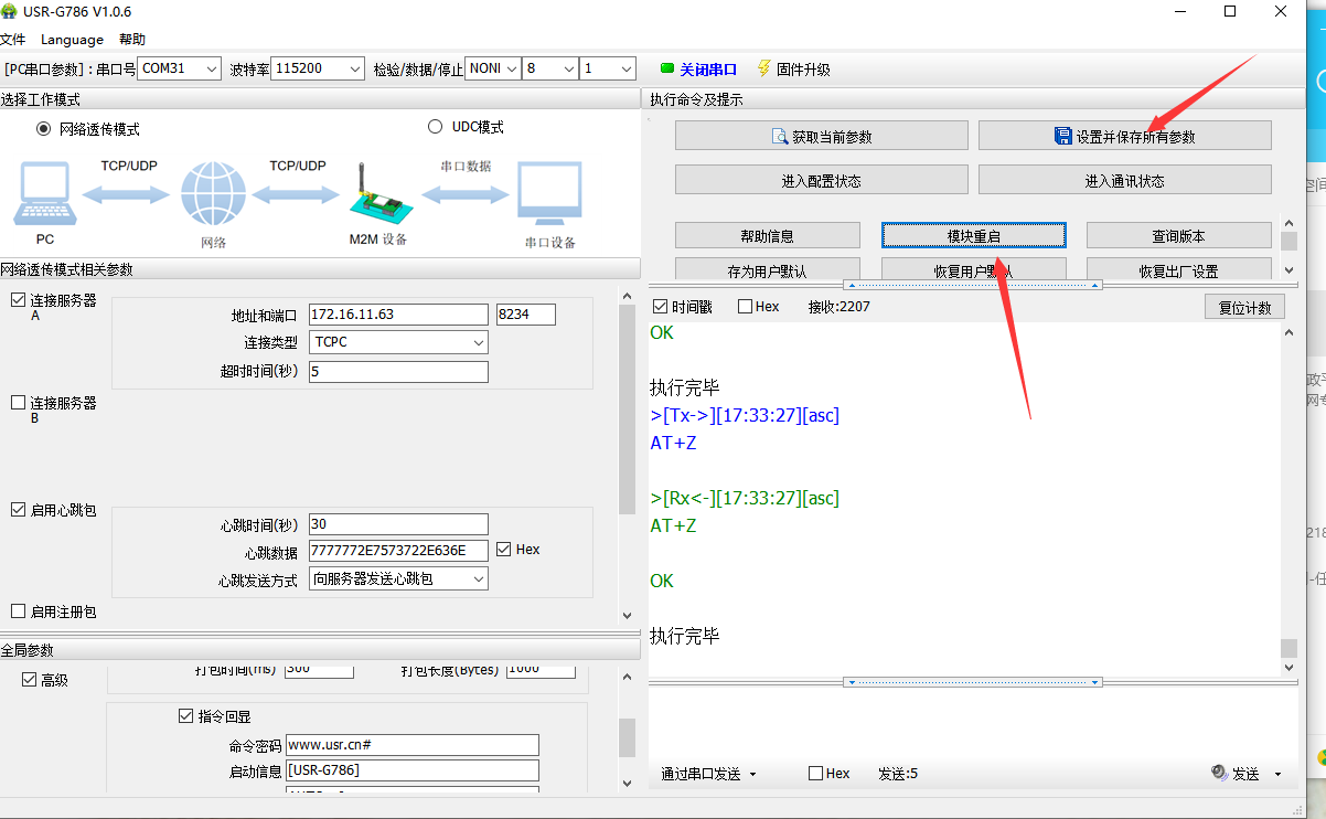 注意:修改的參數(shù)都需要重啟后才能生效,所以最后發(fā)送命令密碼AT+Z重啟DTU