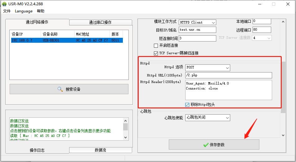 點(diǎn)擊“搜索設(shè)備”當(dāng)搜索列表中出現(xiàn)301的設(shè)備后,單擊搜索到的設(shè)備,IP設(shè)置為DHCP,模塊設(shè)置為Httpd Client模式,請(qǐng)求方式POST,URL為/2.php,設(shè)置服務(wù)器地址test.usr.cn,端口80,設(shè)置并保存所有參數(shù),重啟模塊。(本說明文檔使用為有人測(cè)試服務(wù)器)