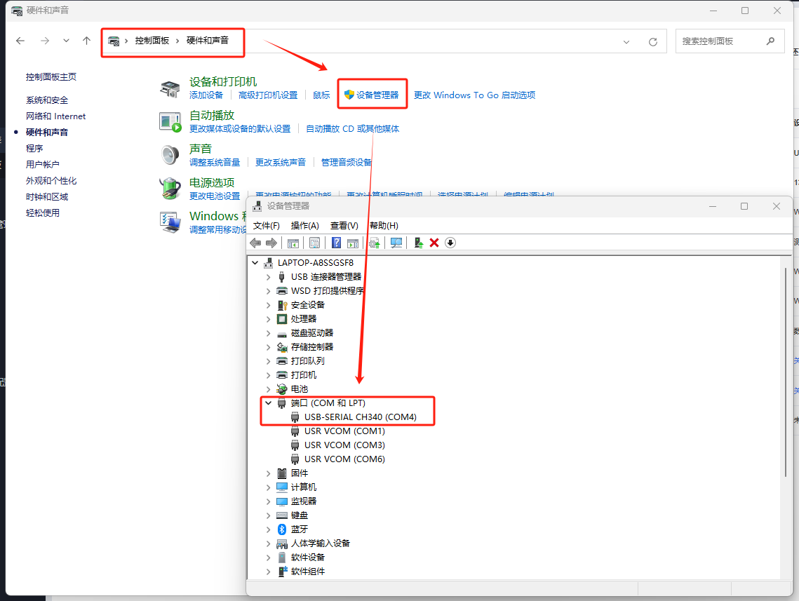 控制面板---硬件和聲音---設備管理器---COM和LPT,確認USB轉換器的COM口是COM4