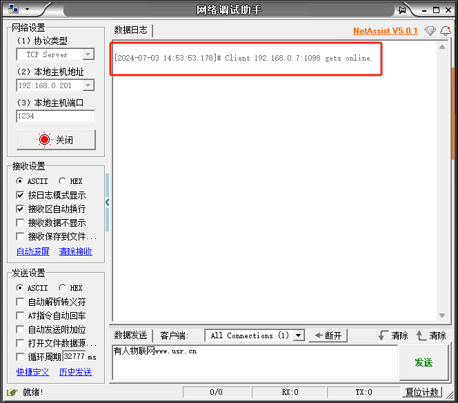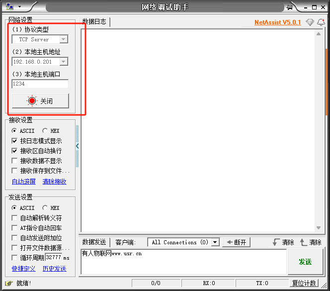 打開一個網絡調試助手,選擇TCP server模式,本地主機192.168.0.201,本地端口號1234