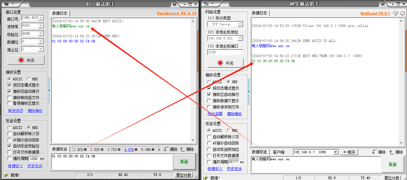 打開一個串口調試助手引用COM4,串口參數選擇9600、NONE、8、1,網絡調試助手和串口調試助手互發數據進行測試。