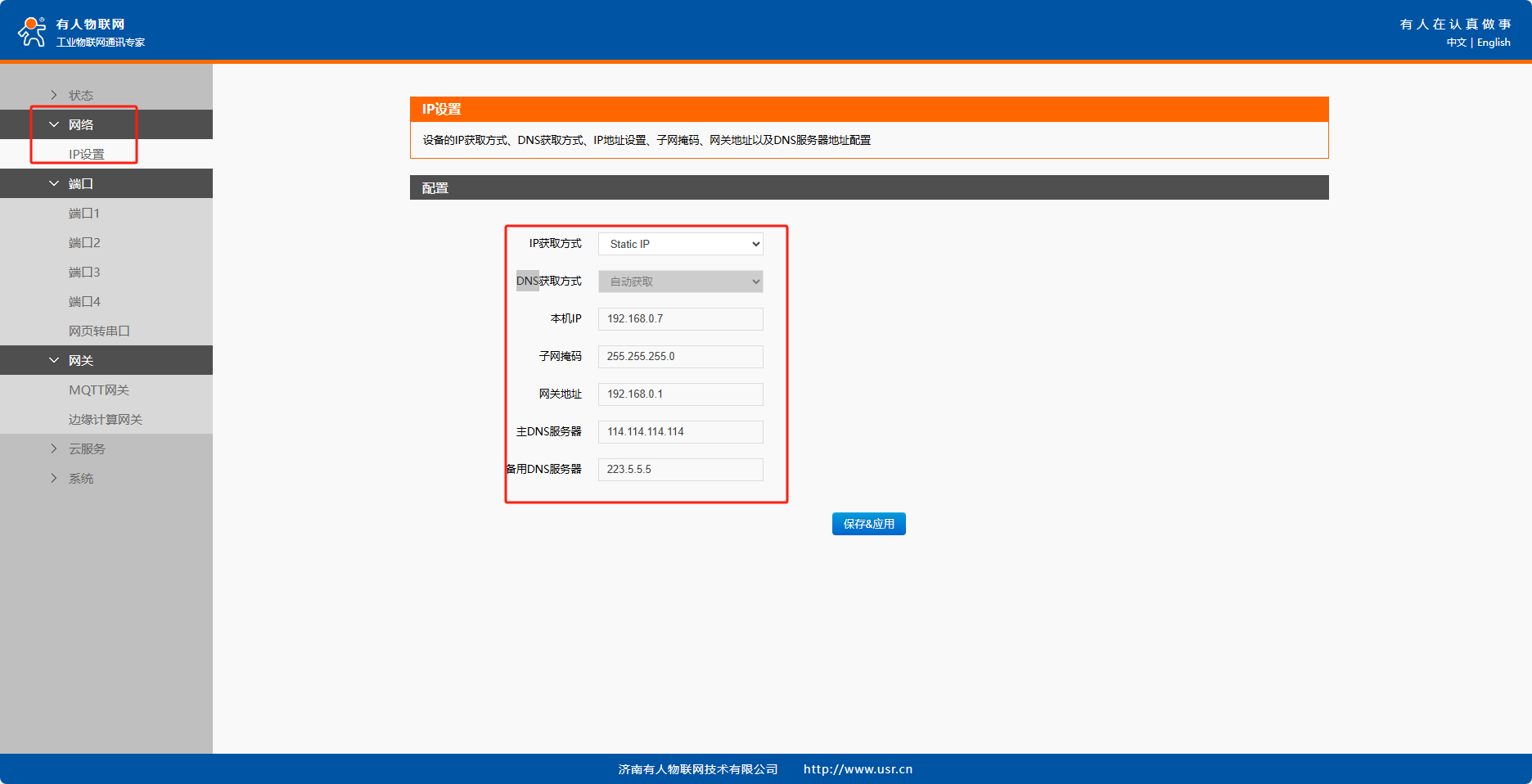 網絡---IP設置,本例中保持出廠默認的靜態IP設置192.168.0.7(用戶可以根據自己實際配置靜態IP和DHCP)