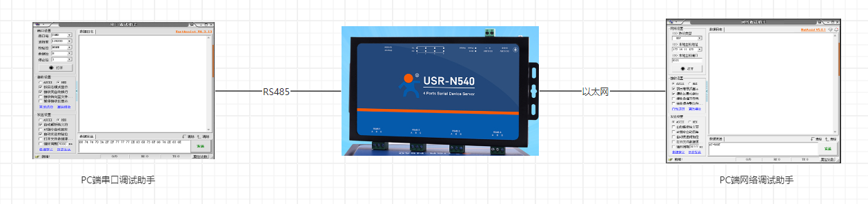 USR-N540-H7 的485串口1接USB-RS485串口線到電腦USB口,網口接網線直連電腦,然后產品接12V電源適配器上電。
