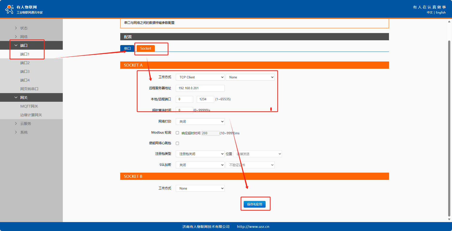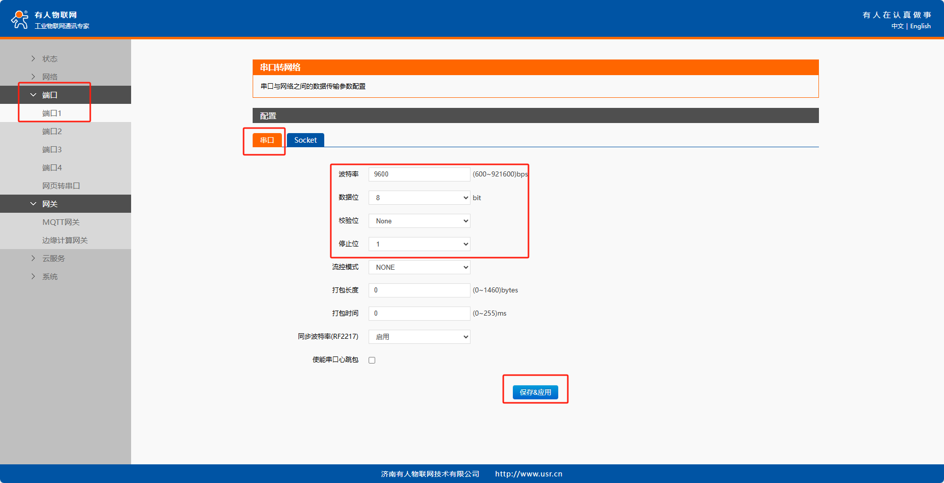 端口---端口1---串口,將串口參數修改為9600、NONE、8、1,保存應用,繼續配置