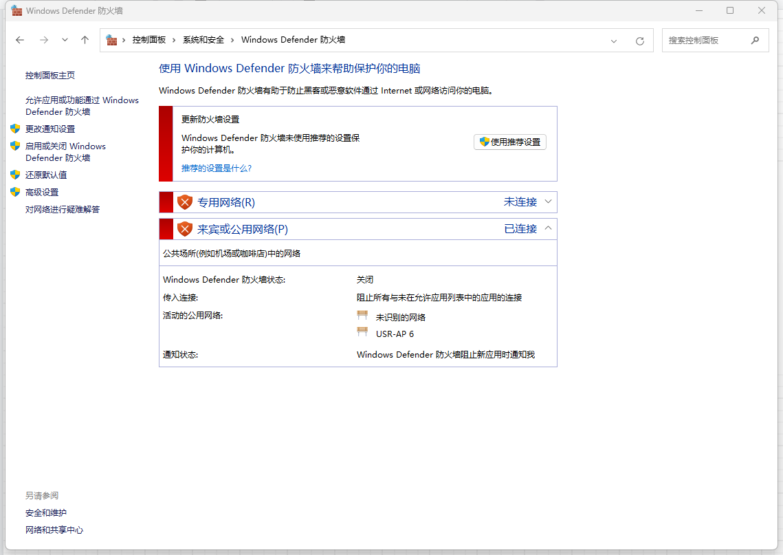 控制面板---系統和安全---Windows Defnder防火墻,關閉防火墻
