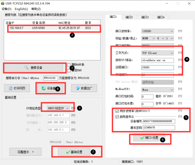 1. 設置N540參數,將網線與電腦直連,搜索設備,將ip改為動態,模塊工作方式改為client,目標地址為有人云地址clouddata.usr.cn,端口為15000