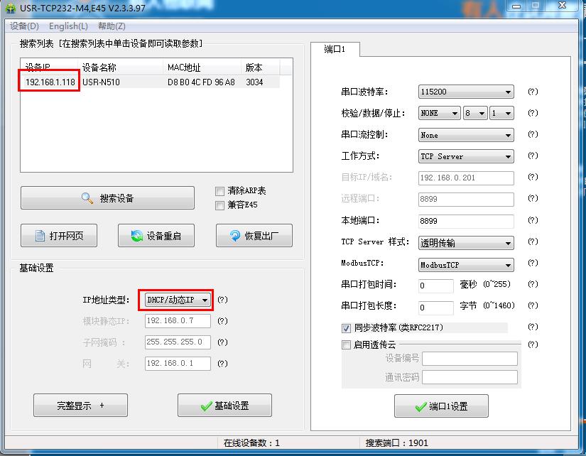 用M4設(shè)置軟件搜索USR-N510的IP是192.168.1.118