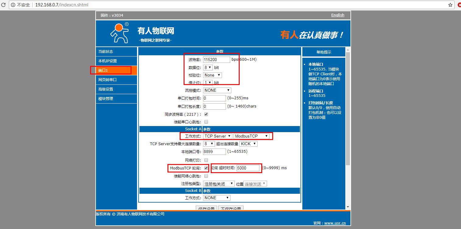 網(wǎng)頁檢查串口參數(shù),工作方式設(shè)置TCP serverModbusTCP,本地端口號默認是8899,Modbus TCP輪詢默認是關(guān)閉,需要勾選開啟MODBUS TCP輪詢。