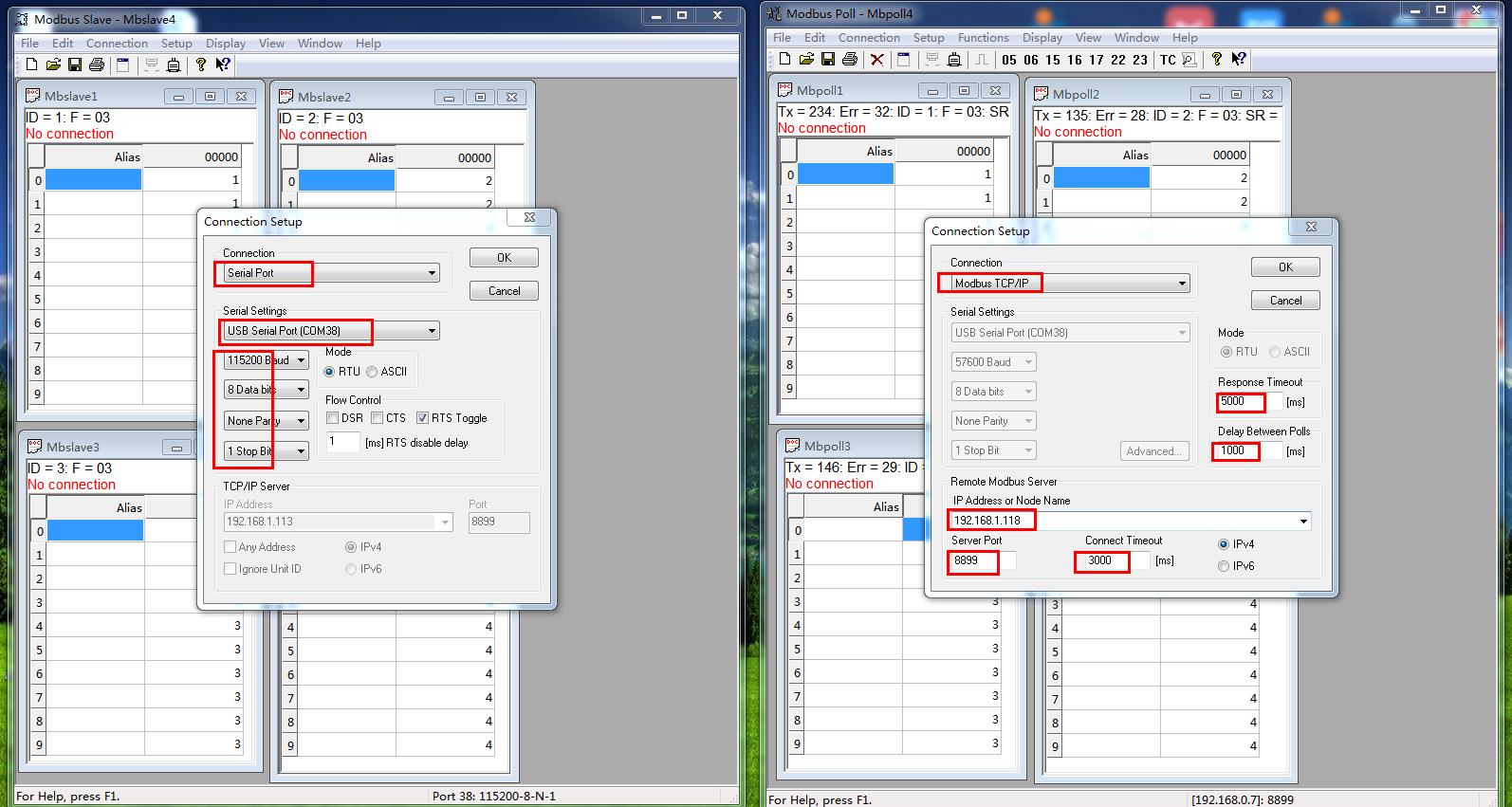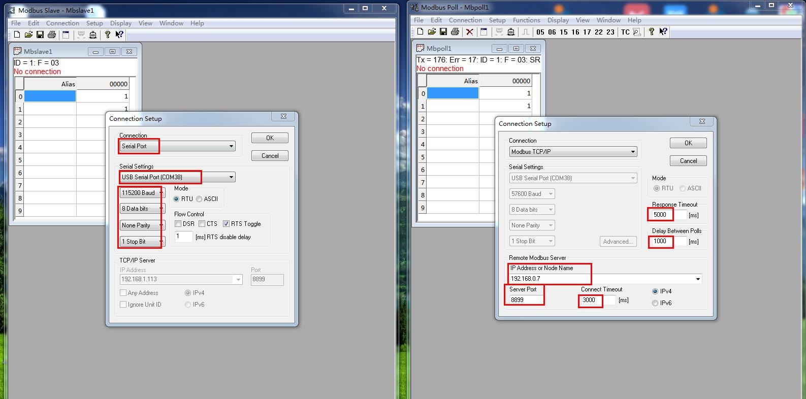 模擬測試用MODBUS SLAVE軟件做串口設(shè)備,用MODBUS POLL軟件做網(wǎng)絡(luò)端。