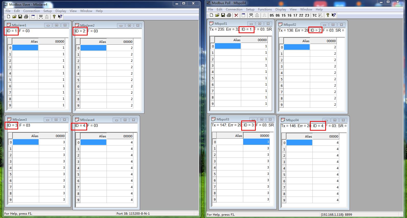MODBUS POLL軟件對應添加4個SLAVE ID,依次是ID 1 ID 2 ID 3 ID 4。