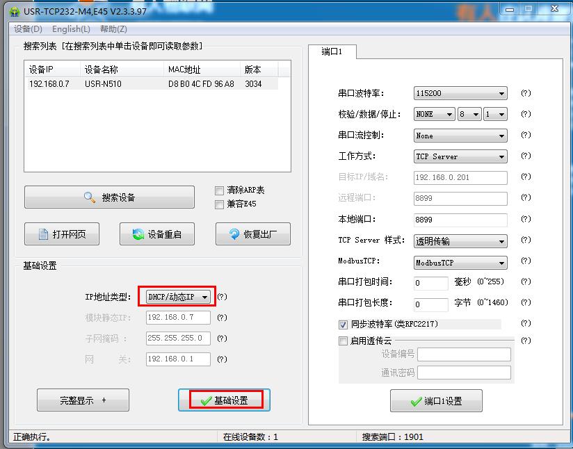 用M4設(shè)置軟件搜索USR-N510的IP。確認是192.168.0.7