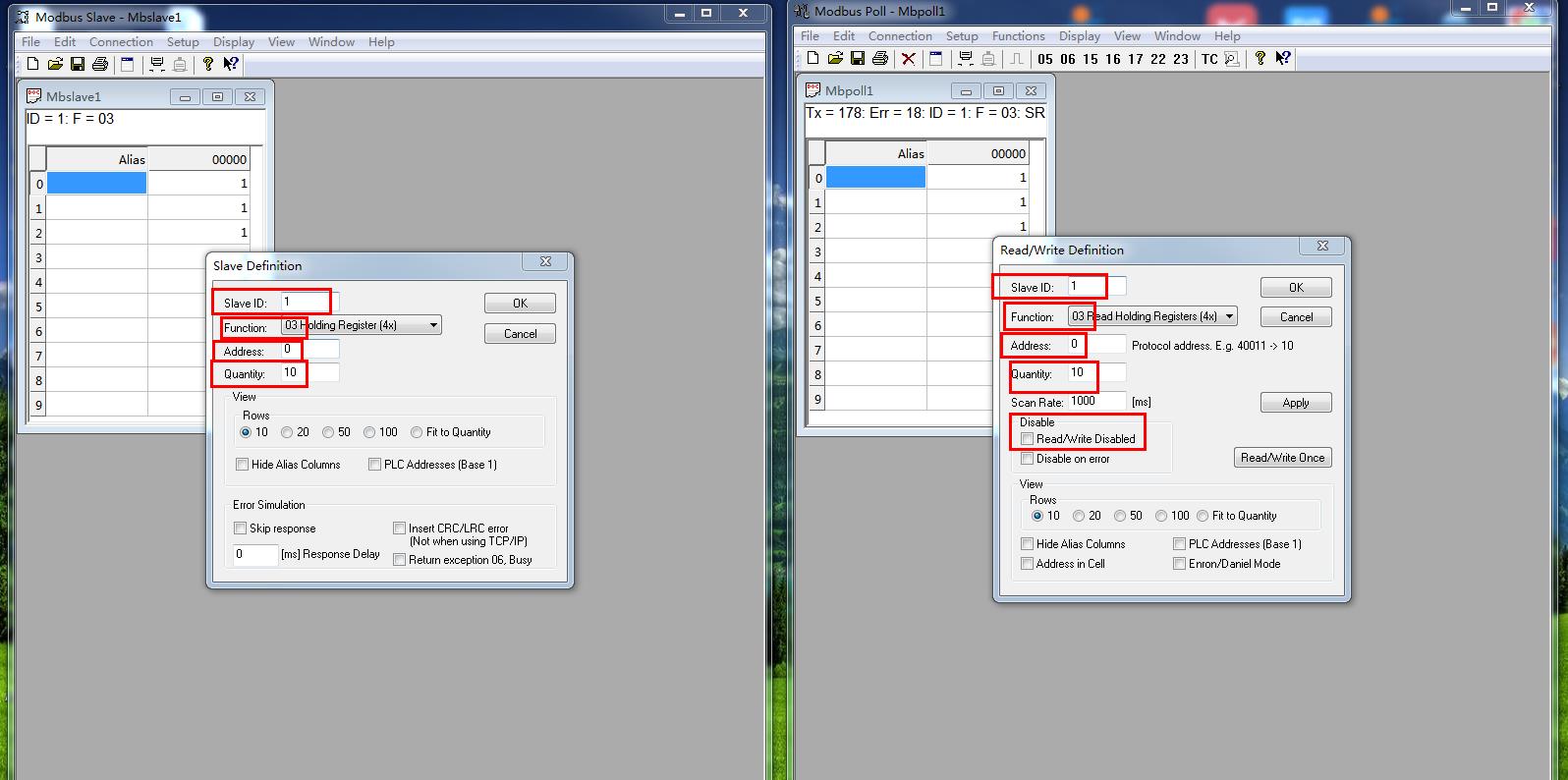 MODBUS SLAVE軟件和MODBUS POLL軟件的設(shè)備ID SLAVE ID需要設(shè)置一致,寄存器起始地址和寄存器數(shù)量設(shè)置一致。舉例,我用的是起始地址0,寄存器數(shù)量10。用的是03功能碼。