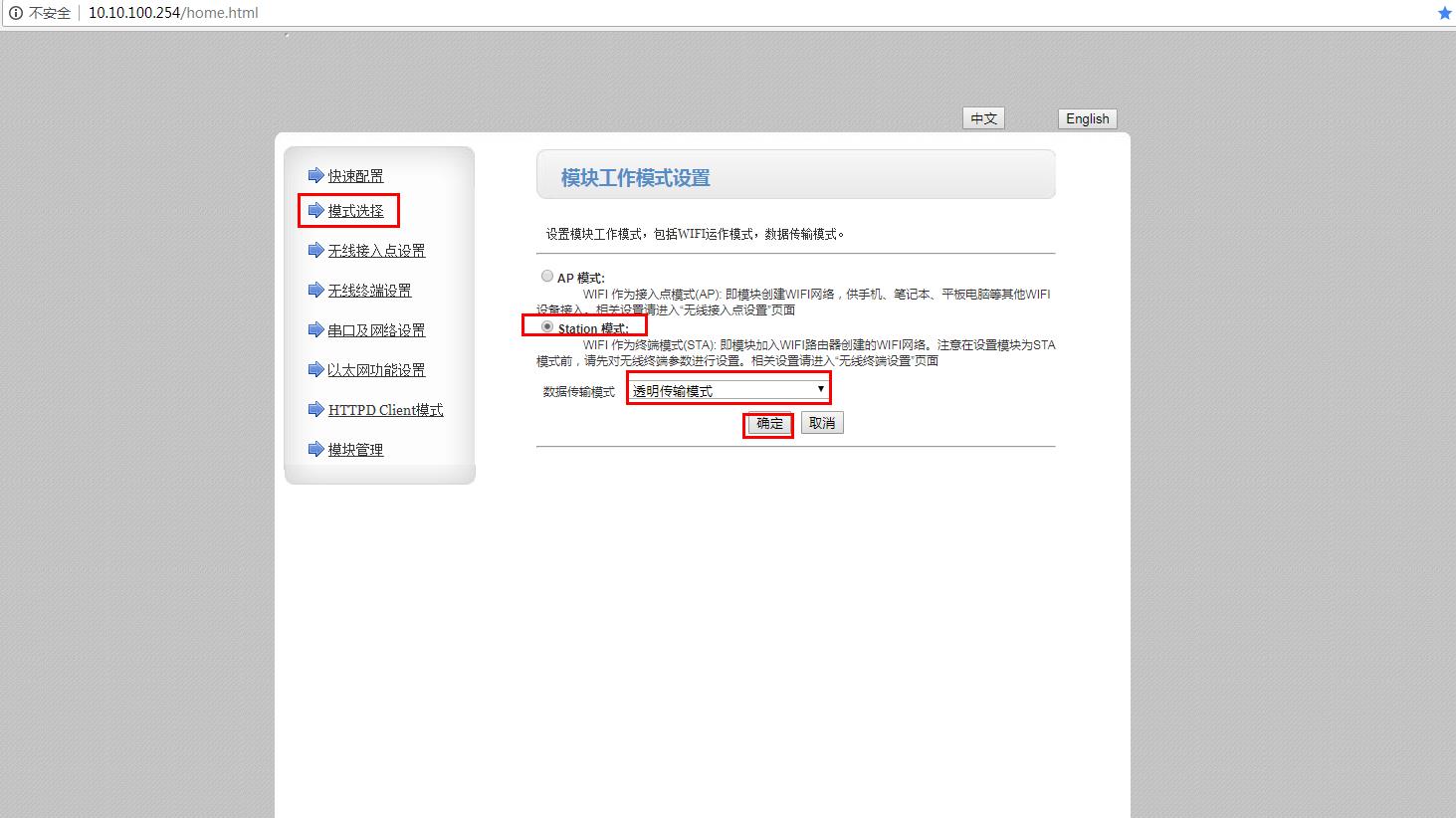 1、登錄之后,在模式選擇中,將USR-W610的工作模式從默認AP模式改為STA模式,點擊確定,會跳出重啟提示,建議不要立刻重啟,需要所有網頁參數設置完畢之后,最后再重啟USR-W610。