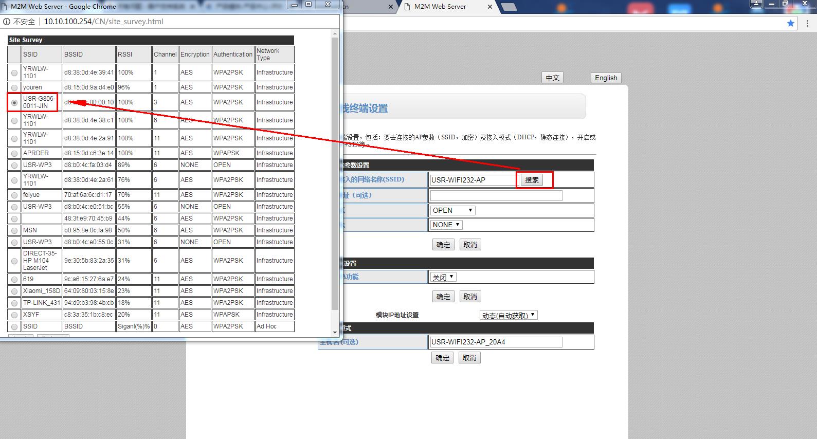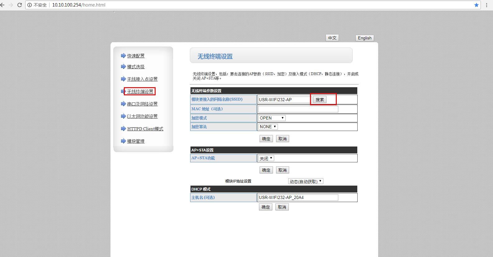 在無線終端設置中,點擊模塊要接入的網絡名稱SSID,可以手動輸入USR-W610設置STA模式要連接路由器wifi的名稱,或者點擊后面的搜索,搜索路由器的wifi。勾選,并點擊APPLY應用。跳出輸入路由器wifi密碼提示,輸入路由器的wifi密碼。點擊確定。