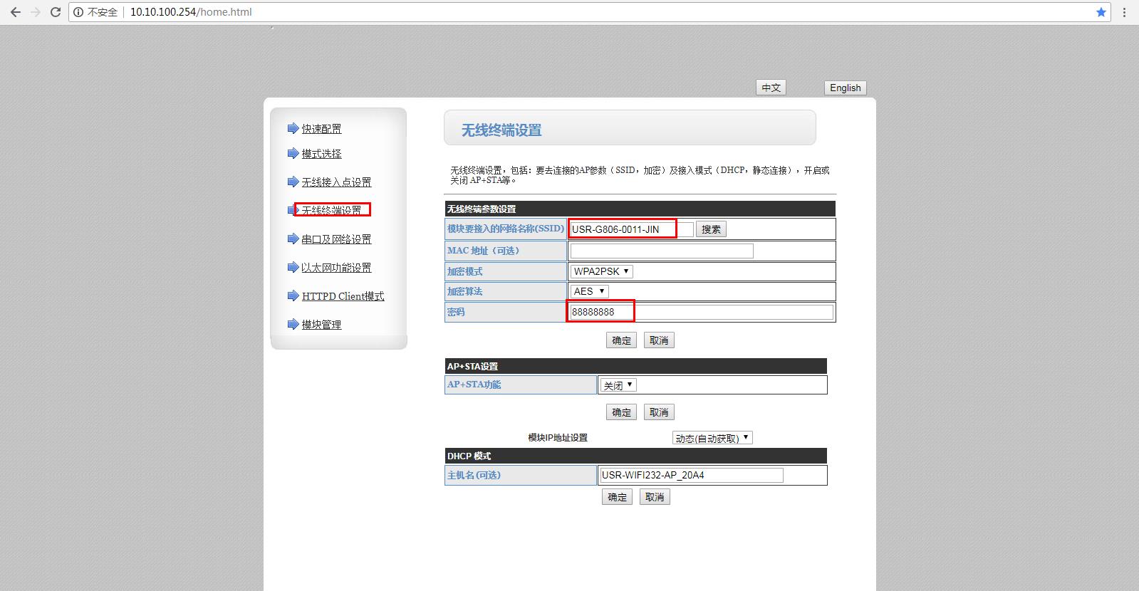 用USR-W610的IP 10.10.100.254 登錄USR-W610的網頁,然后設置橋接模式相關參數: