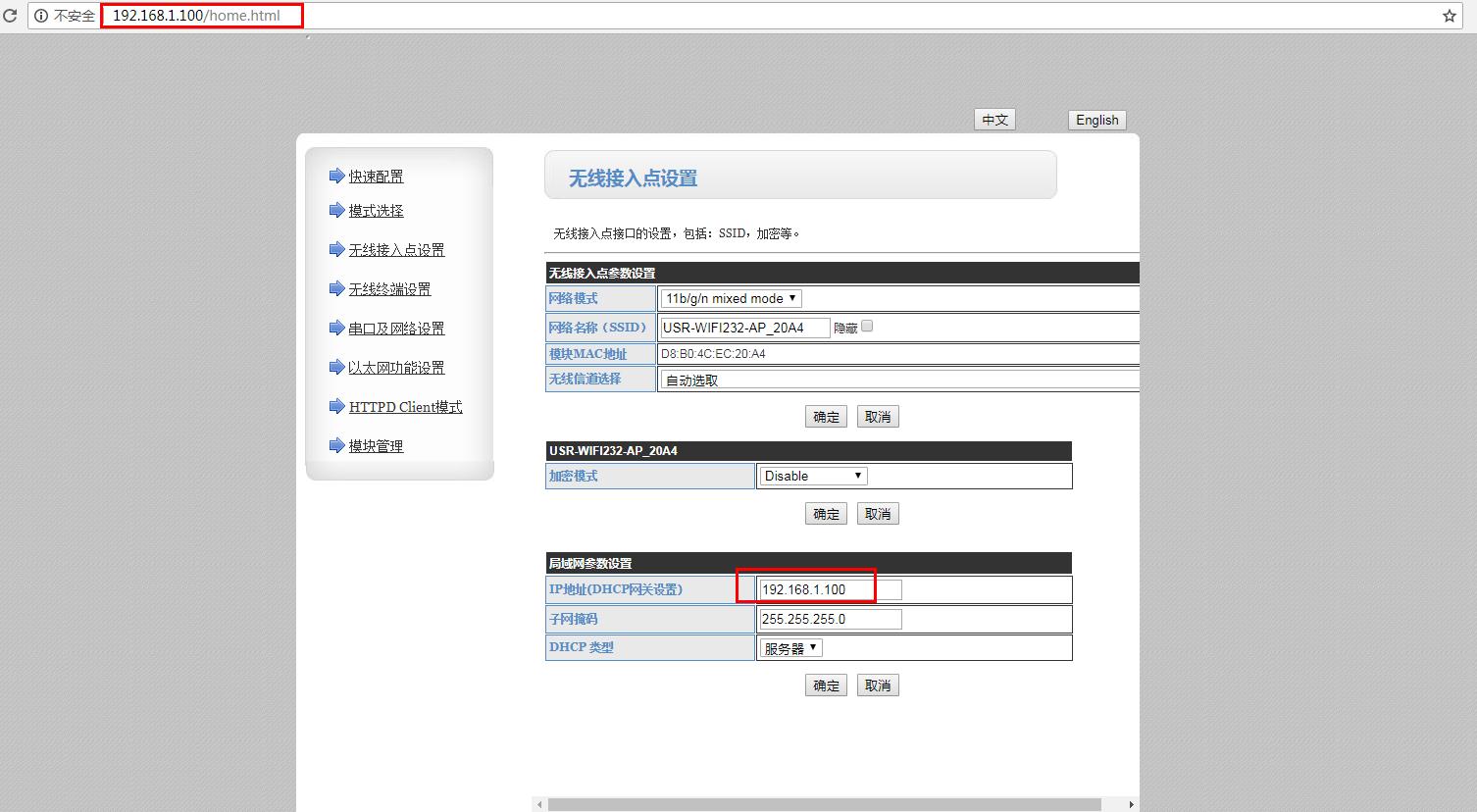 1、電腦連接路由器的wifi,電腦瀏覽器使用設置的IP 192.168.1.100,登錄USR-W610的內置網頁。