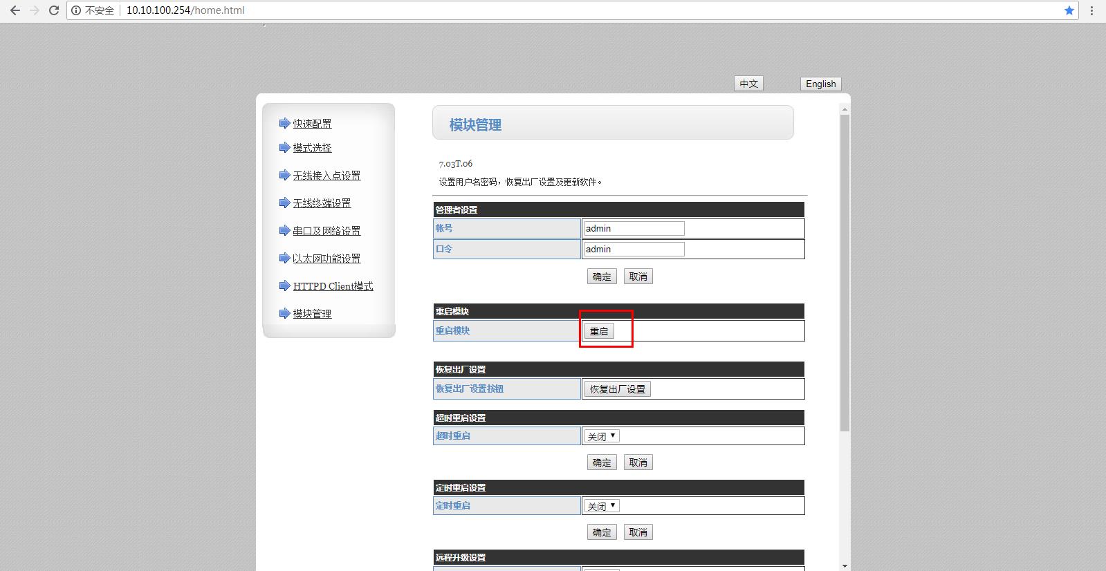 3、使用USR-W610默認IP,10.10.100.254,在瀏覽器輸入登錄USR-W610內置網頁,登錄名是admin,登錄密碼admin。