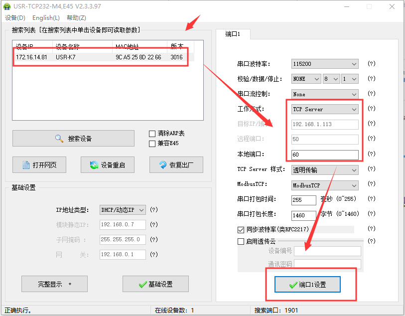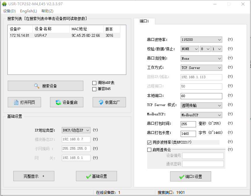 點擊“搜索設備”,當搜索列表中出現K7的設備后,單擊搜索到的設備,設置配置信息并保存(動態IP)