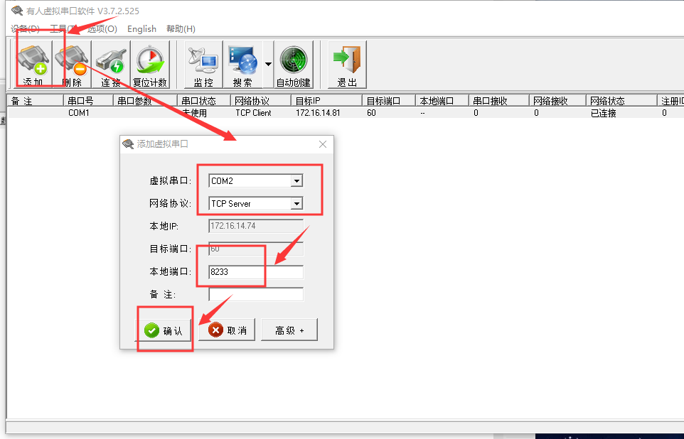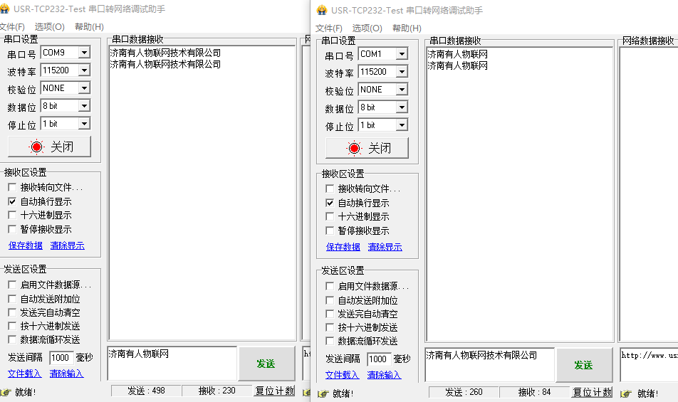 同時打開兩個串口轉網絡助手軟件。一個選擇虛擬串口,一個選擇COM9,即可進行收發測試