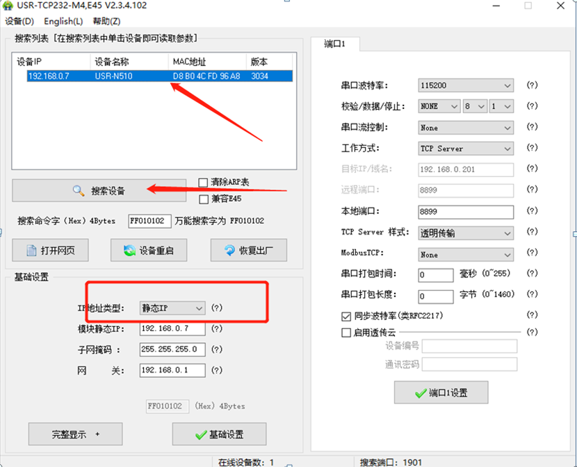 3. 打開M4設置軟件,點擊搜索設備,可看到搜索到的設備,點擊選中,可看到IP地址類型為靜態IP。