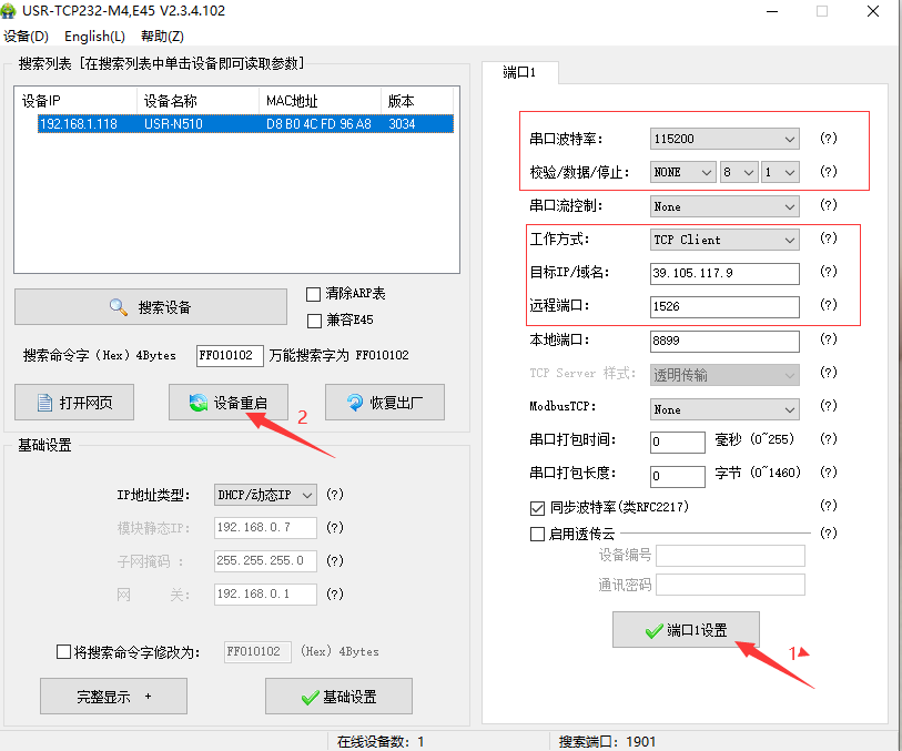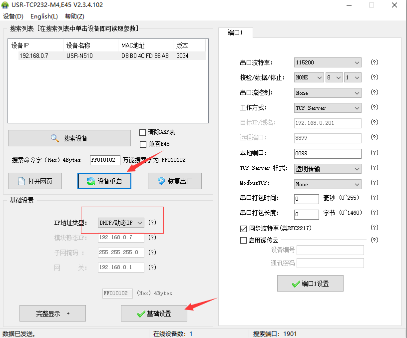 5. 網線直連N510的網口和路由器的LAN口,保證N510正常上網,電腦連接路由器的WiFi,電腦和路由器同一網段,設置軟件重新搜索設備,可看到路由器分配給N510的IP。