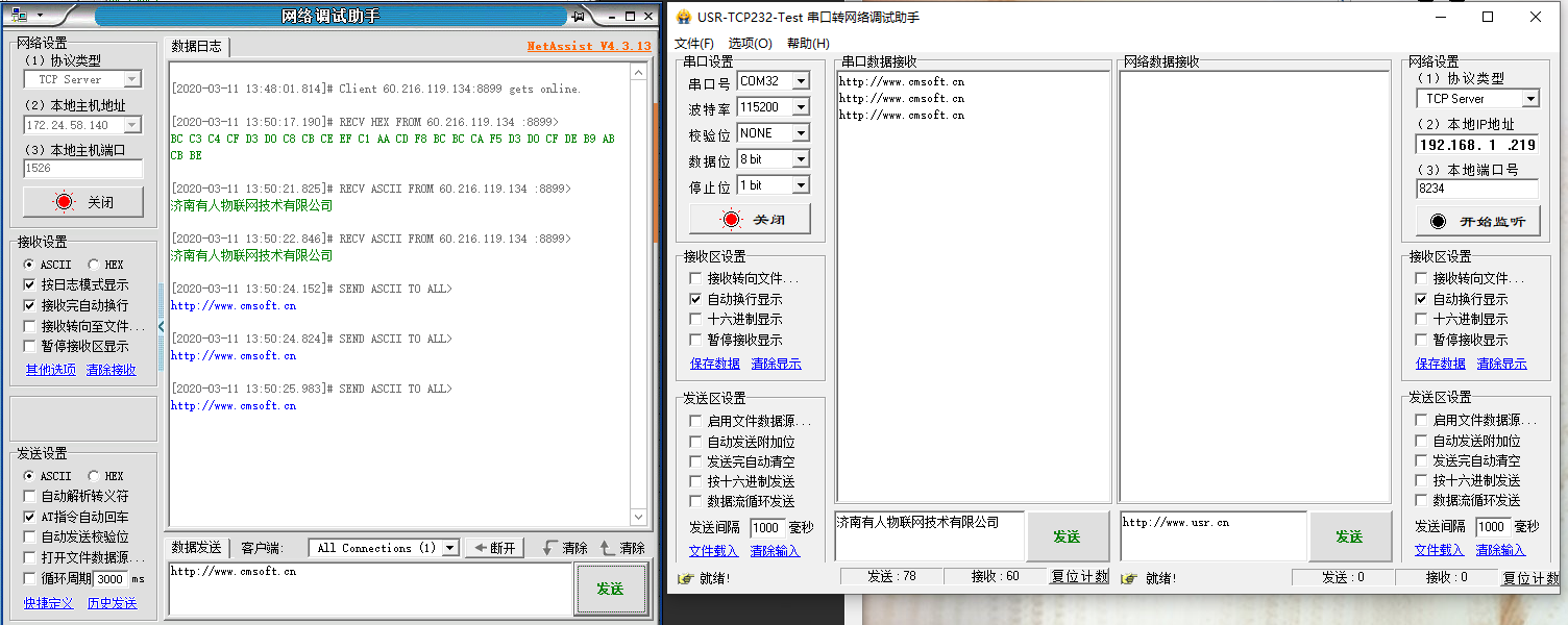 7.打開串口,串口參數和N510的串口參數保持一致,網絡端點擊鏈接,如下圖有連接對象顯示,網絡端和串口端互發數據測試