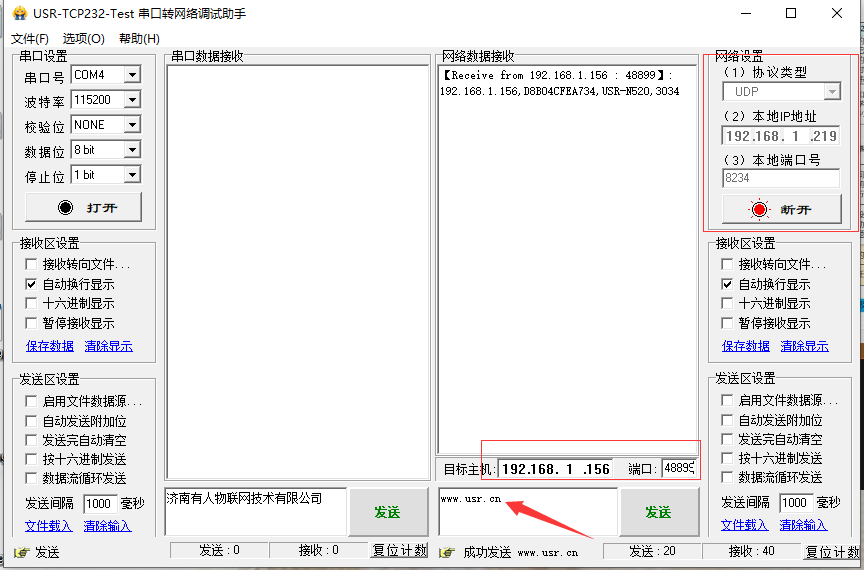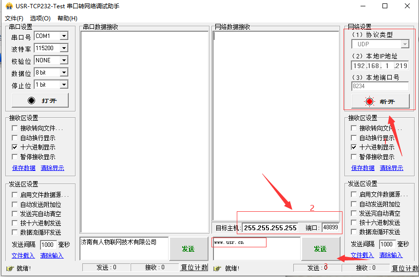 6. 打開串口調(diào)試助手,網(wǎng)絡(luò)設(shè)置為UDP協(xié)議類型,本地IP為192.168.1.219,本地端口:8234,點(diǎn)擊連接,更改目標(biāo)主機(jī)IP:255.255.255.255,端口:48899,通過(guò)廣播的方式發(fā)送搜索關(guān)鍵字www.0575400.com(區(qū)分大小寫)