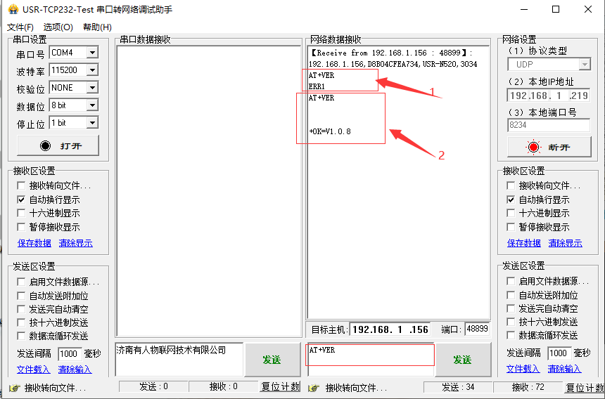 8. 查詢參數(shù):根據(jù)AT指令集發(fā)送標(biāo)準(zhǔn)AT指令,AT+VER查詢版本號(hào),(AT指令后加回車換行),AT指令格式不正確,即返回ERR,AT+UART1查詢串口參數(shù)