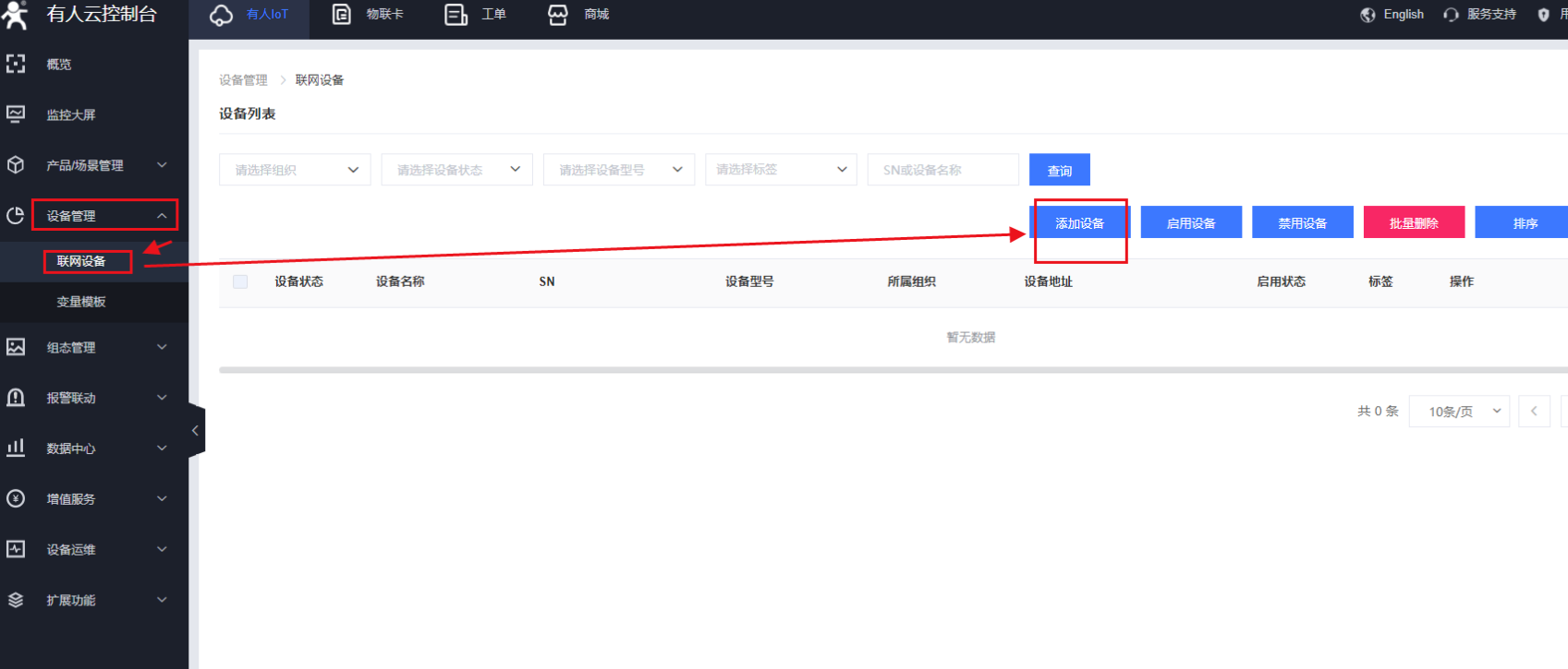 有人云登陸之后,點擊“設備管理”---“聯網設備”,點擊“添加設備”