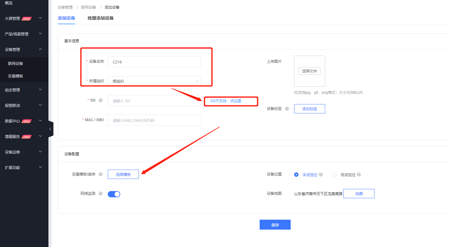3.點擊“SN不支持,點這里”,跳轉到用ID添加,ID是云系統自動生成,不需要客戶自己設置,通訊密碼可以自定義8位密碼。點擊選擇模板