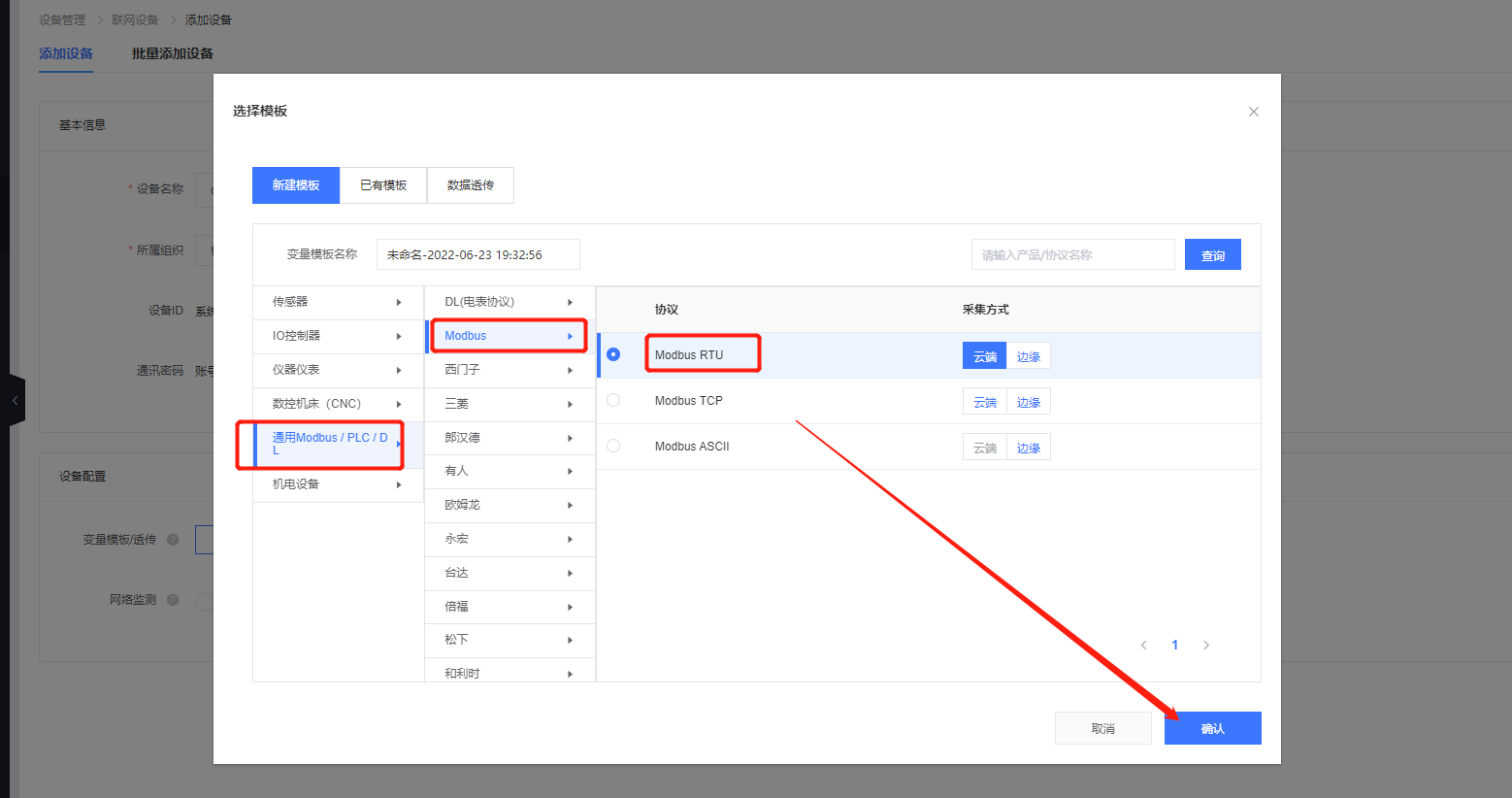 4.添加設備模板,選擇“Modbus” - “Modbus RTU” - “云端采集”,點擊“確認添加”。